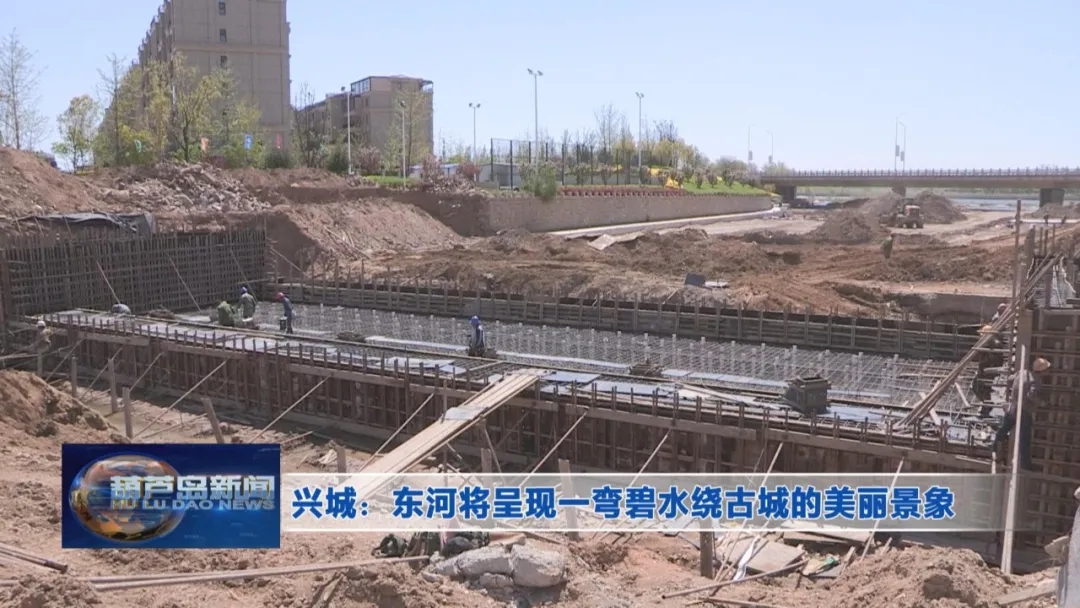 在興城東河、靠近海河大橋附近,一座鋼壩閘雛形在河道上顯現,工人們正在緊張施工。